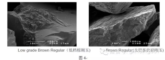 4、在電子顯微鏡透視下,低檔的棕剛玉與高品級的是完全不同的,低級品由于雜質(zhì)其表面呈現眾多微裂紋,二者比較見(jiàn)圖3。在高溫(如磨削時(shí))下(1000℃)熱處理后會(huì )發(fā)生相變,我們稱(chēng)之為生出“癌細胞”,而高品級的仍然表面晶瑩,鋒芒突出,二者比較見(jiàn)圖4。