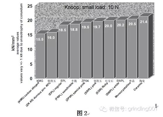 3、硬度:圖2是幾種磨料的硬度比較示意圖,由圖得知,鋯剛玉的硬度是不高的,半脆剛玉比棕剛玉的硬度高一點(diǎn),陶瓷磨料的硬度***高。
