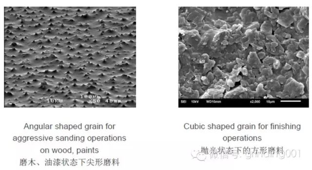 2、顆粒形狀有:針形pointed、標準形angular、方形cubik。微粉亦應分為3類(lèi)。圖1為磨木材、油漆狀態(tài)下的標準型(尖形)和拋光狀態(tài)下的方形磨料。